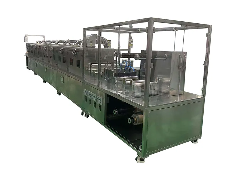 تُستخدم الماكينة لإنتاج الشرائح الفموية سريعة الذوبان المستخدمة في منتجات طعام الحيوانات الأليفة. يتميز خط الانتاج باستقرار عملية التصنيع والمعالجة والتجفيف لضمان جودة ثابتة. أثناء التشغيل، يوضع محلول سائل يحتوي على المكونات الغذائية الخاصة بالحيوانات الأليفة على بطانة حاملة متحركة بشكل متساوي ومحكم. ثم تمر الشرائح عبر مناطق تجفيف لإزالة الرطوبة تدريجيًا وتشكيل الشريحة. بعد التجفيف والتبريد، يمكن قص الشرائح مباشرة وتجهيزها لعمليات التعبئة التالية، حيث تُقطع إلى شرائح أصغر حسب المقاسات المطلوبة.